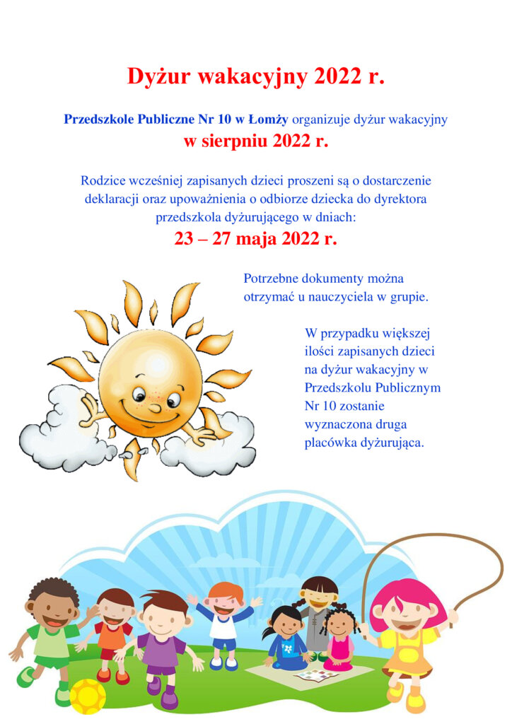 18 maj Dyżur wakacyjny – aktualizacja Upowaznienie do odbioru dziecka – SIERPIEŃ PP10 Deklaracja zgłoszenia dziecka na dyżur – SIERPIEŃ 2022 PP10