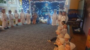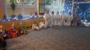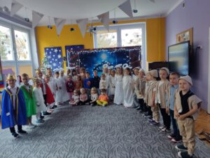 W oczekiwaniu na Święta Bożego Narodzenia  przedstawiliśmy dzisiaj Jasełka czyli historię Narodzenia Pana Jezusa. Wcieliliśmy się w role Maryi, Józefa, Królów, pasterzy  oraz aniołków. Towarzyszyły nam piękne kolędy i pastorałki, przeplatane tańcami. Najpierw wystąpiliśmy przed kolegami i koleżankami z młodszej grupy Po południu na widowni zasiadły nasze rodziny. Przedstawienie było bardzo udane o czym świadczyły gromkie brawa oraz liczne pochwały. Teraz możemy już spokojnie wypatrywać pierwszej gwiazdki….