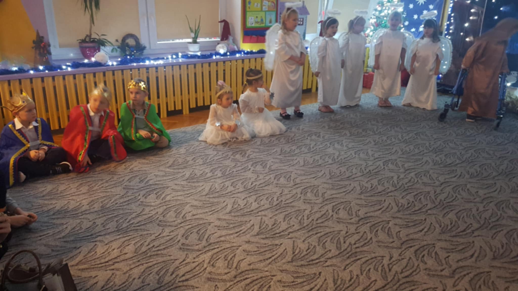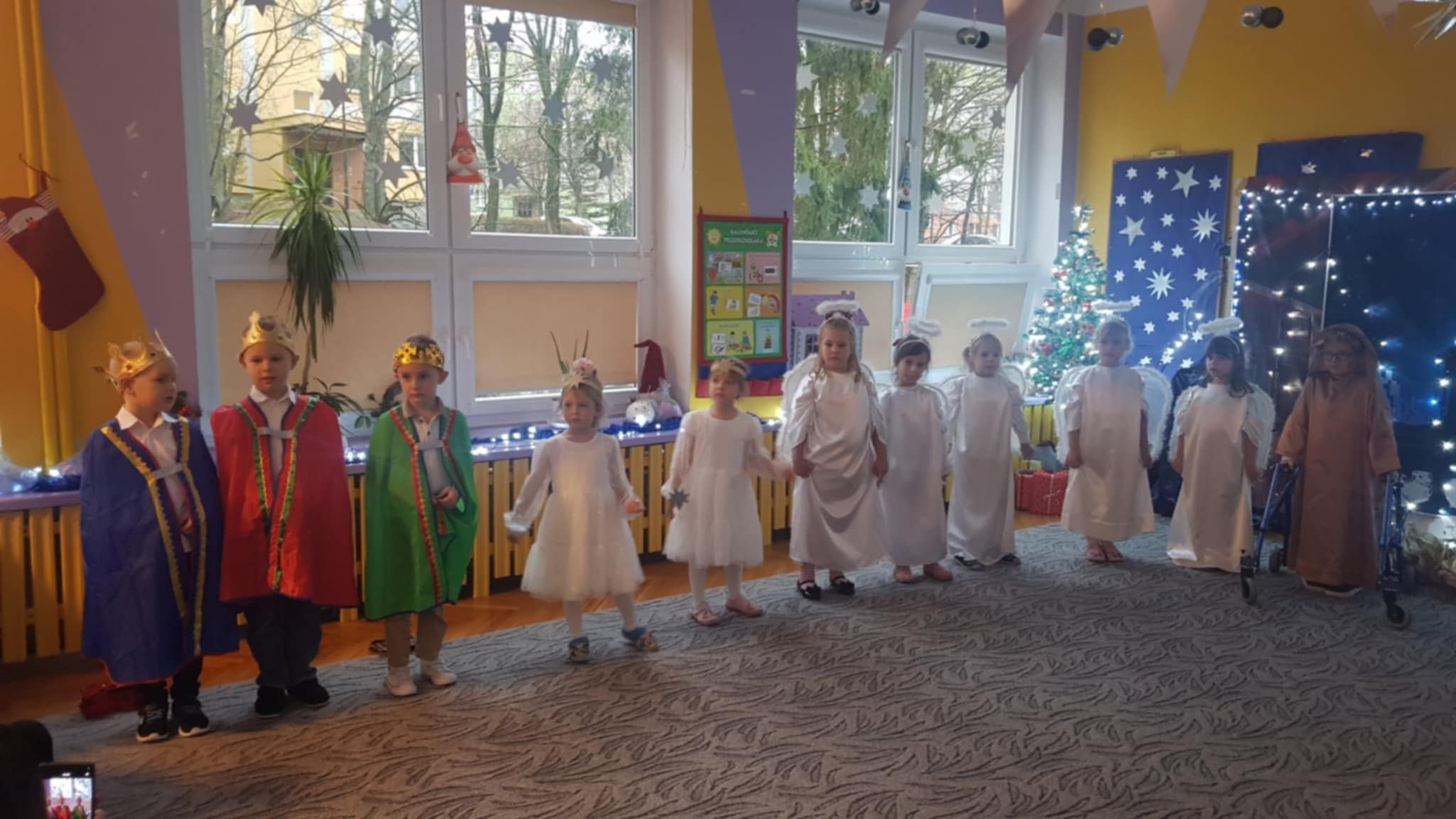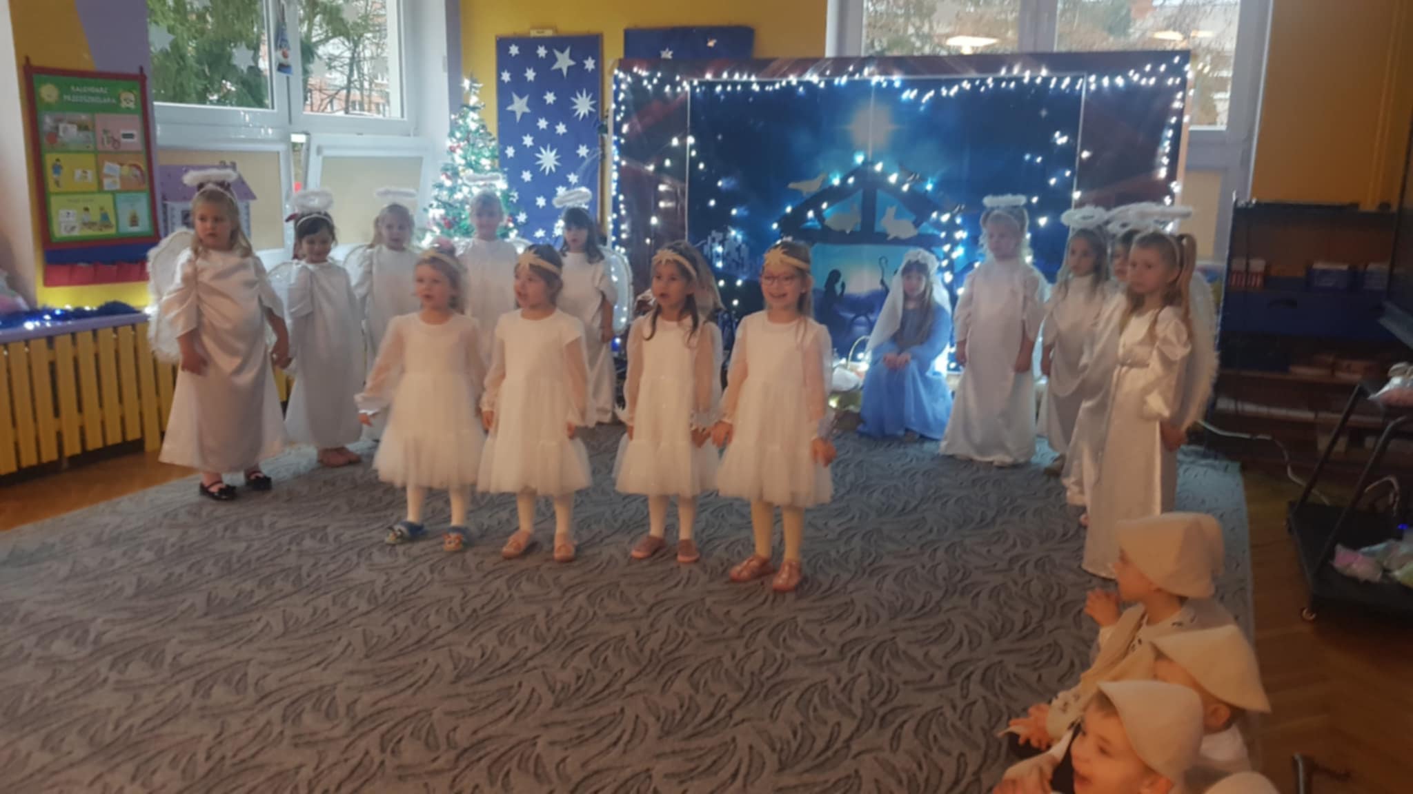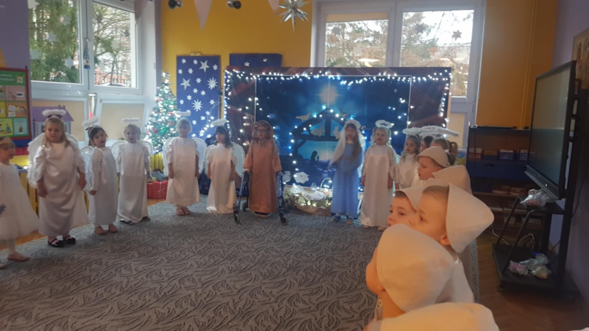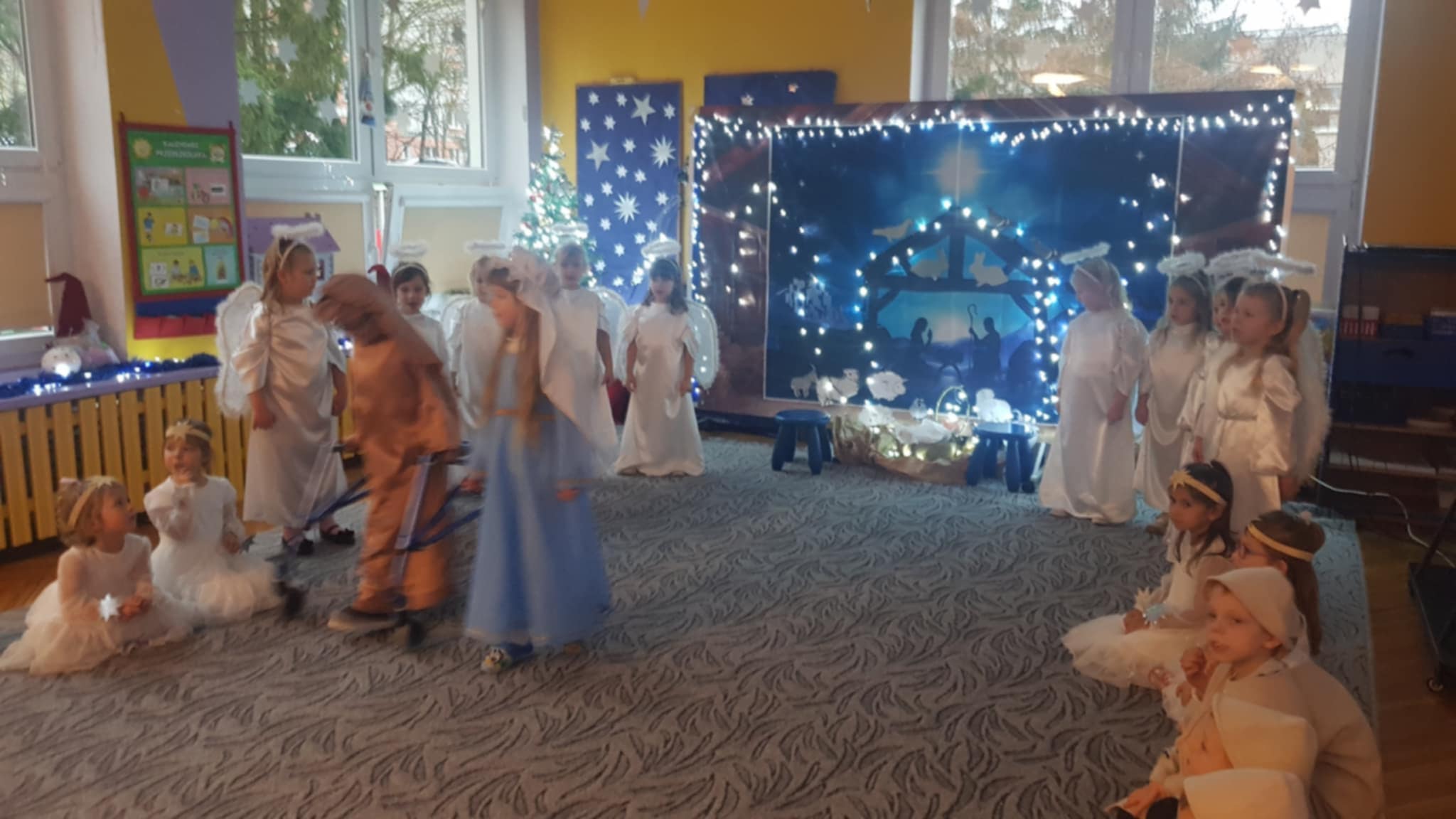 W oczekiwaniu na Święta Bożego Narodzenia  przedstawiliśmy dzisiaj Jasełka czyli historię Narodzenia Pana Jezusa. Wcieliliśmy się w role Maryi, Józefa, Królów, pasterzy  oraz aniołków. Towarzyszyły nam piękne kolędy i pastorałki, przeplatane tańcami. Najpierw wystąpiliśmy przed kolegami i koleżankami z młodszej grupy Po południu na widowni zasiadły nasze rodziny. Przedstawienie było bardzo udane o czym świadczyły gromkie brawa oraz liczne pochwały. Teraz możemy już spokojnie wypatrywać pierwszej gwiazdki….