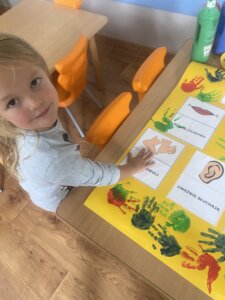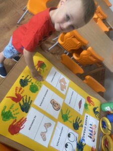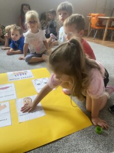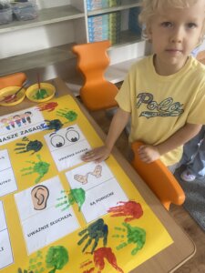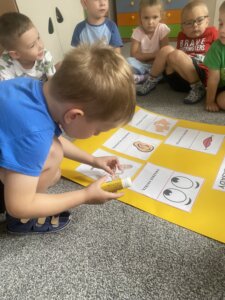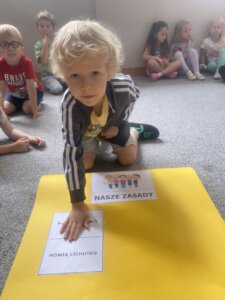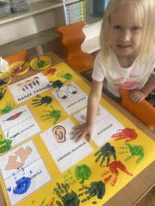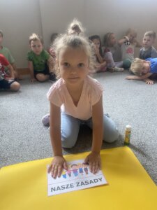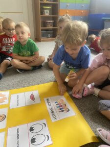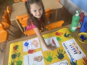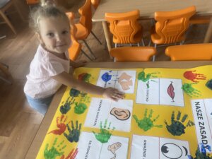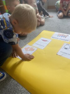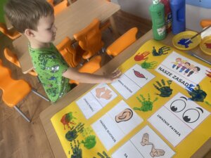 Przedszkolaki zapoznały się z ważną umową, jaką jest kodeks przedszkolaka. Na podstawie obrazków, najmłodsi poznali właściwy sposób zachowania się w różnych sytuacjach w przedszkolu.