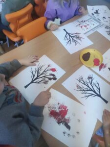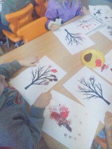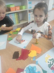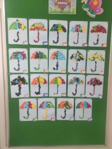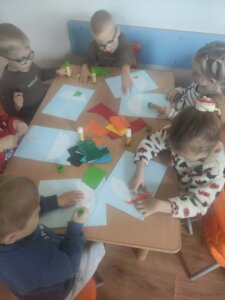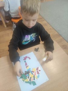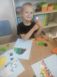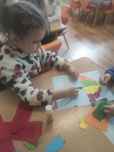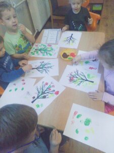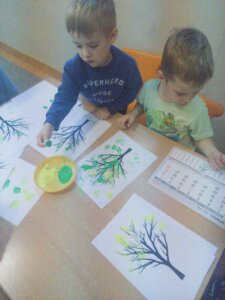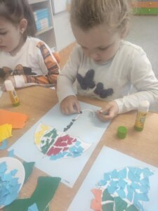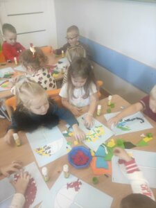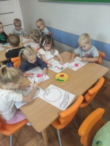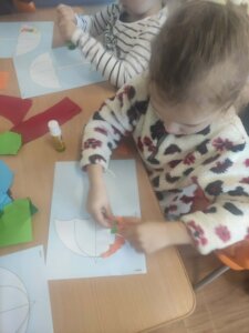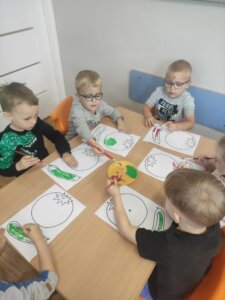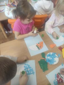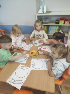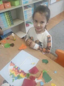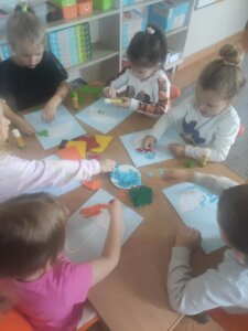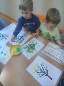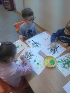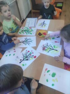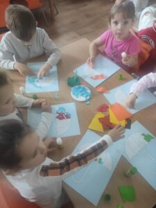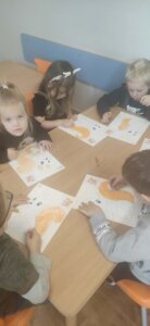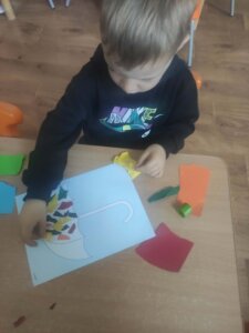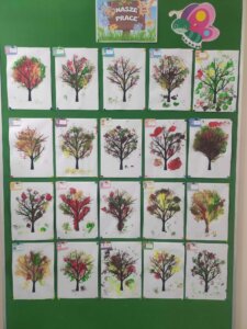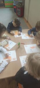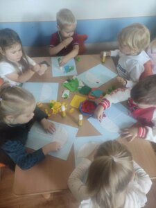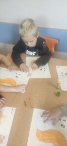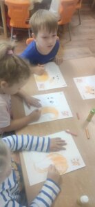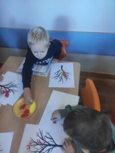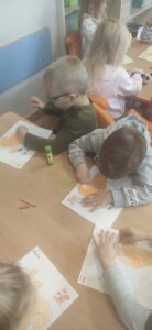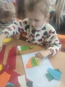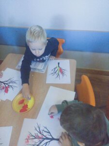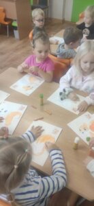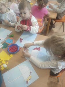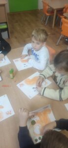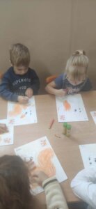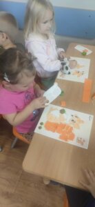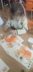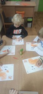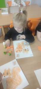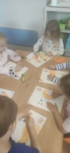 W październiku dzieci zrobiły wiele prac plastycznych. Robiliśmy parasole i wiewiórki techniką wydzieranki, kolorowaliśmy farbami, stemplowaliśmy farbami i wiele innych.