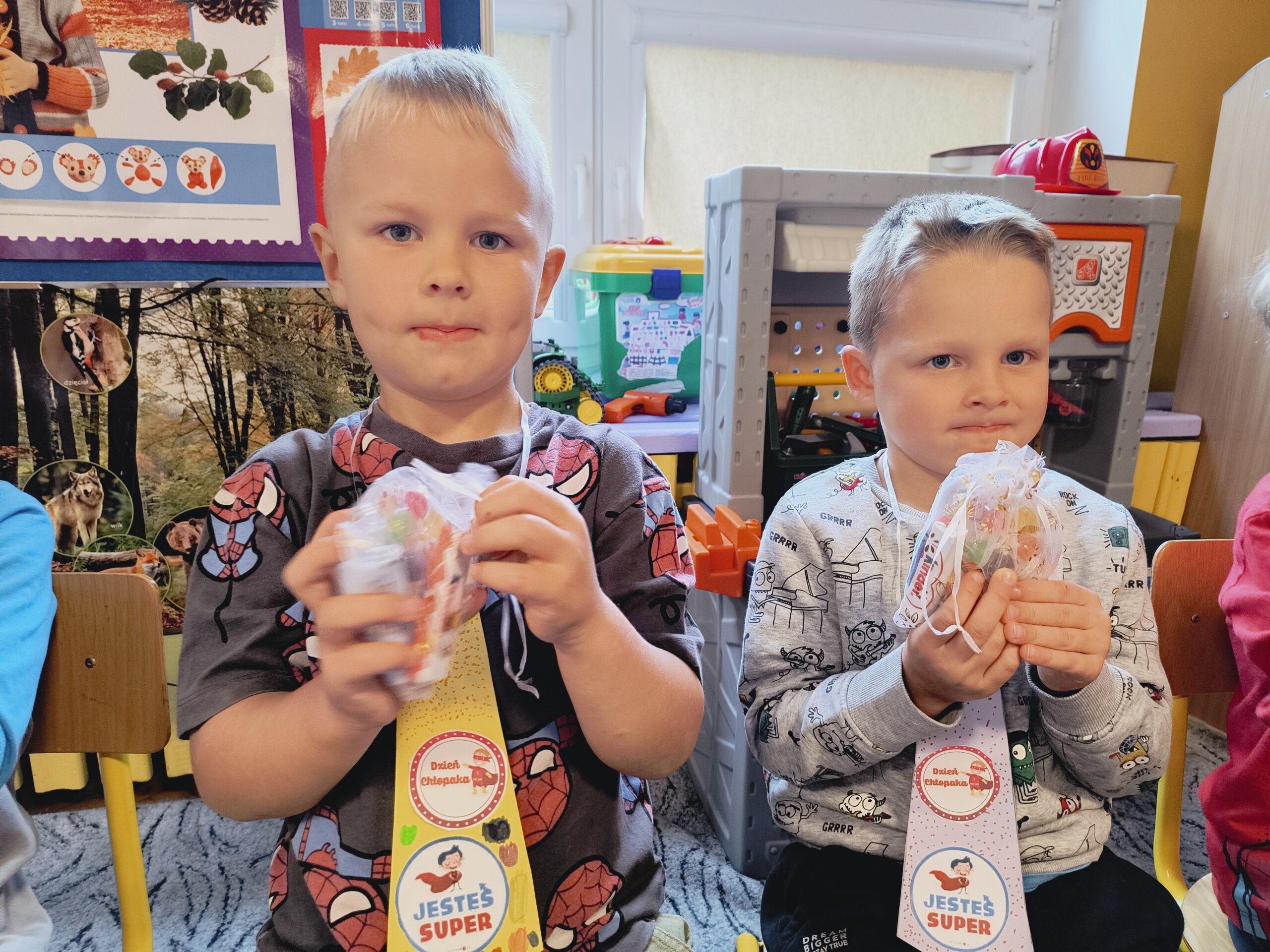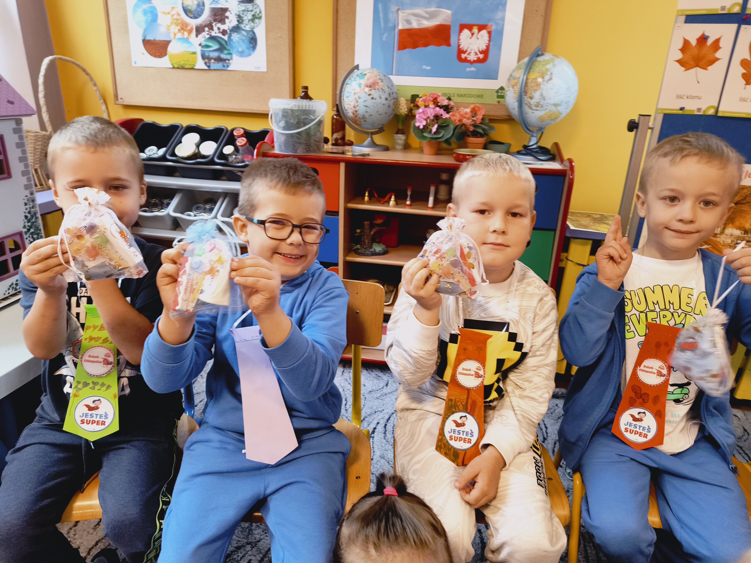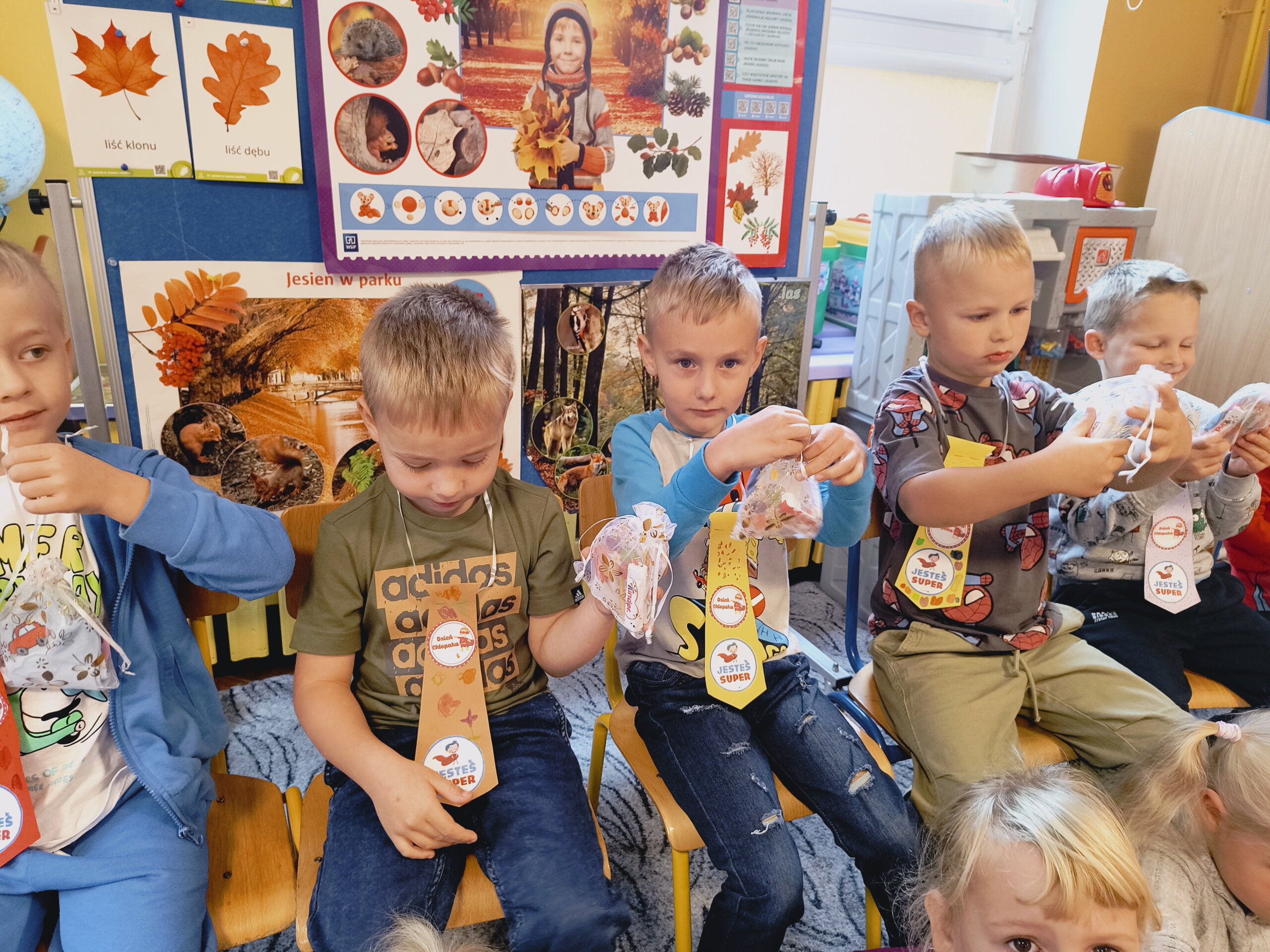 Dziś swoje święto mieli chłopcy. Dziewczynki przygotowały rano dla chłopców specjalne krawaty na tę okazję. Najpierw uroczyście odśpiewały 100lat, a następnie wręczyły kolorowe krawaty Super Chłopaka a także upominki przygotowane przez rodziców. Potem były zabawy przy muzyce, tańce w kole i parach oraz zabawy sportowe dla wszystkich.