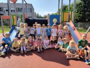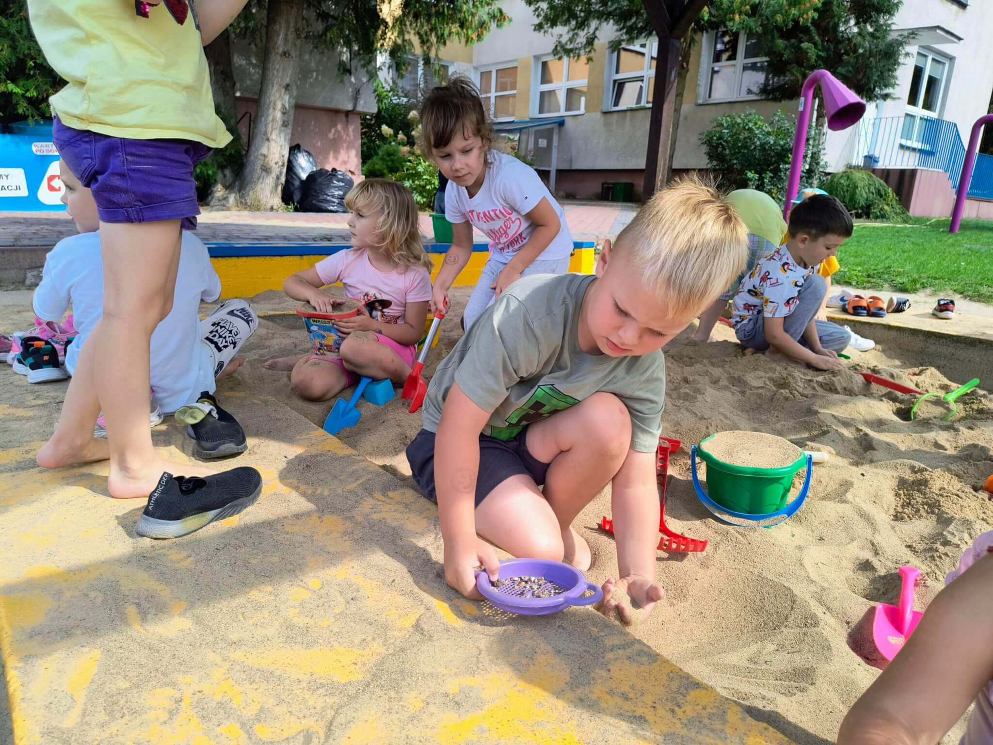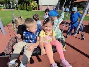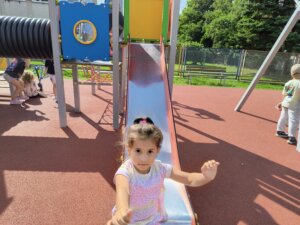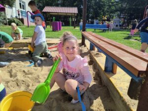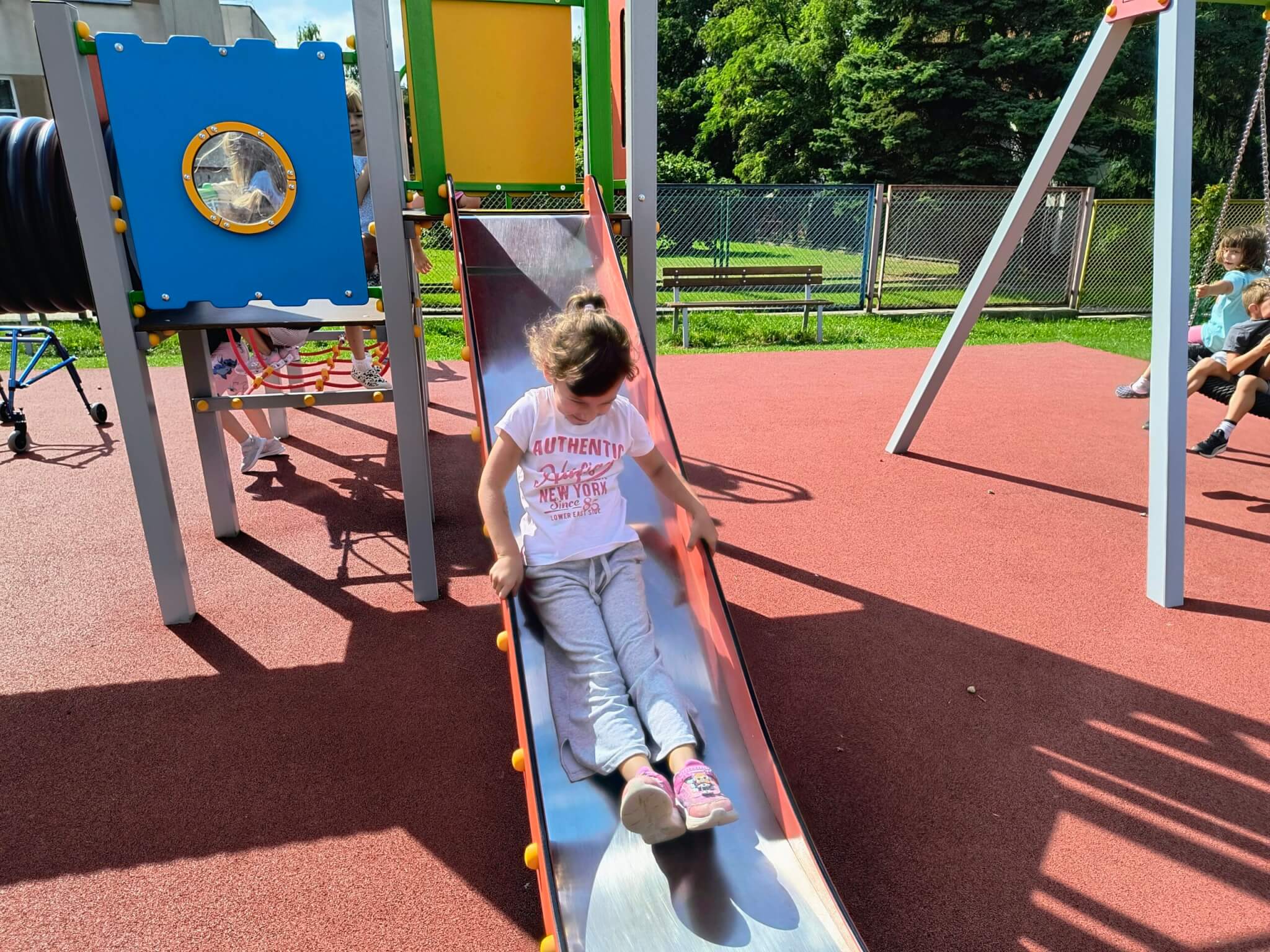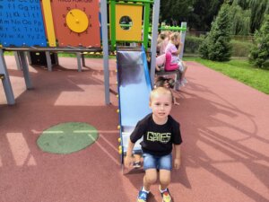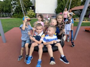 Słonecznie i ciepło rozpoczął się nasz pobyt w grupie V. Wrześniowa pogoda zachęcała nas do zabaw na dworze i korzystania w pełni z nowego placu zabaw.