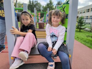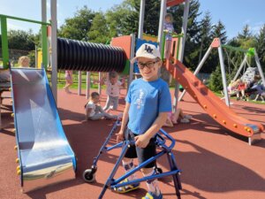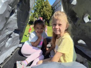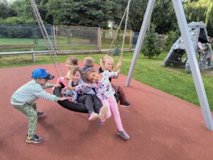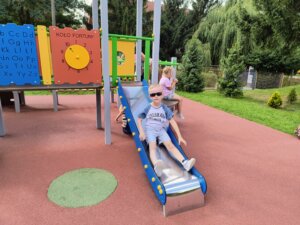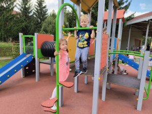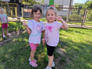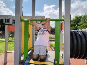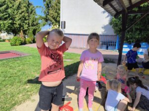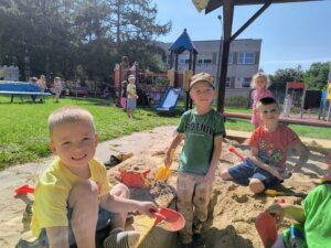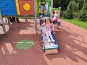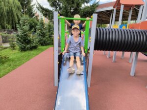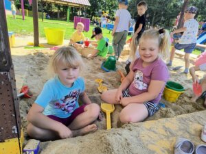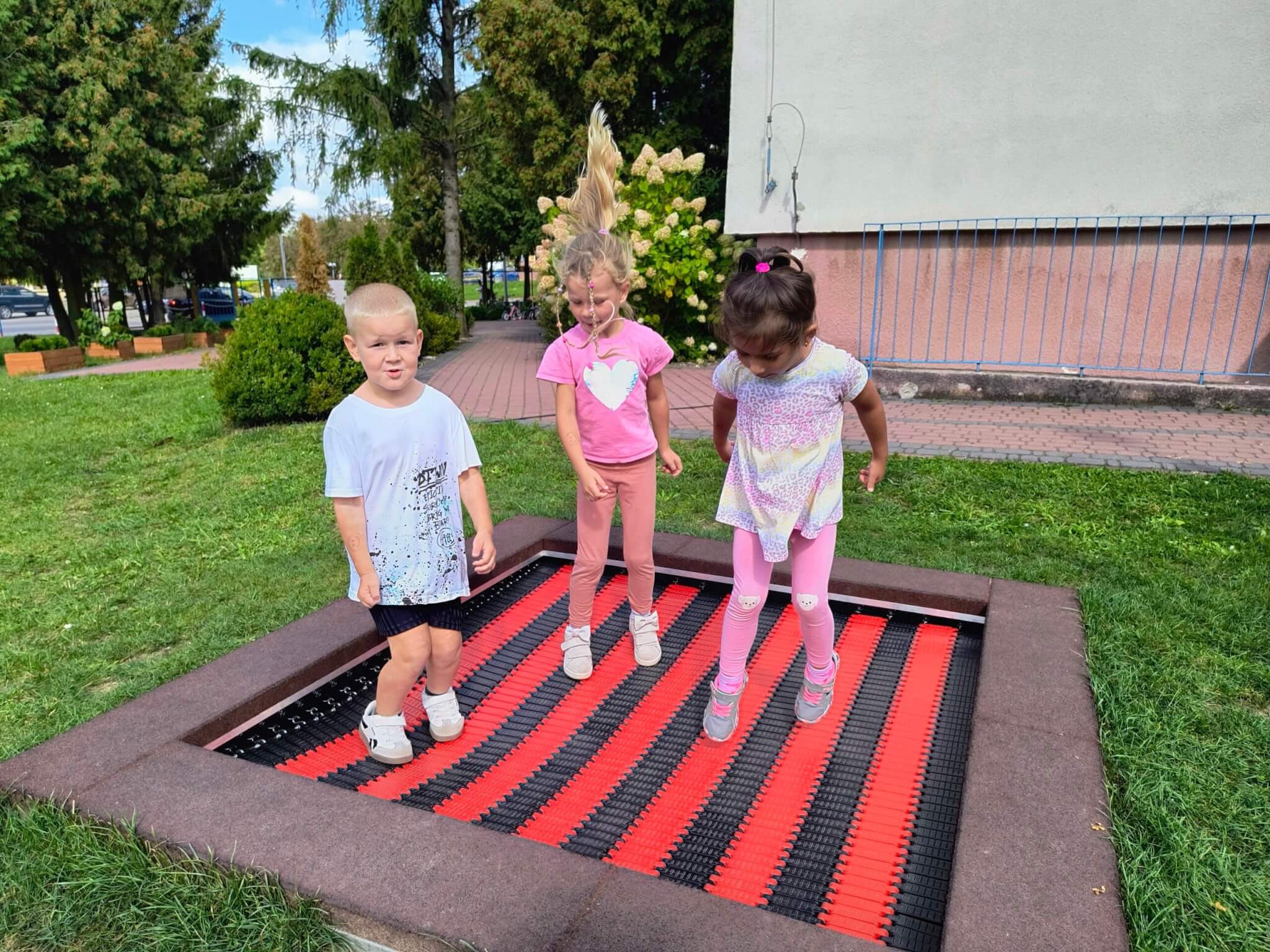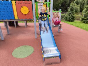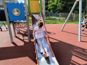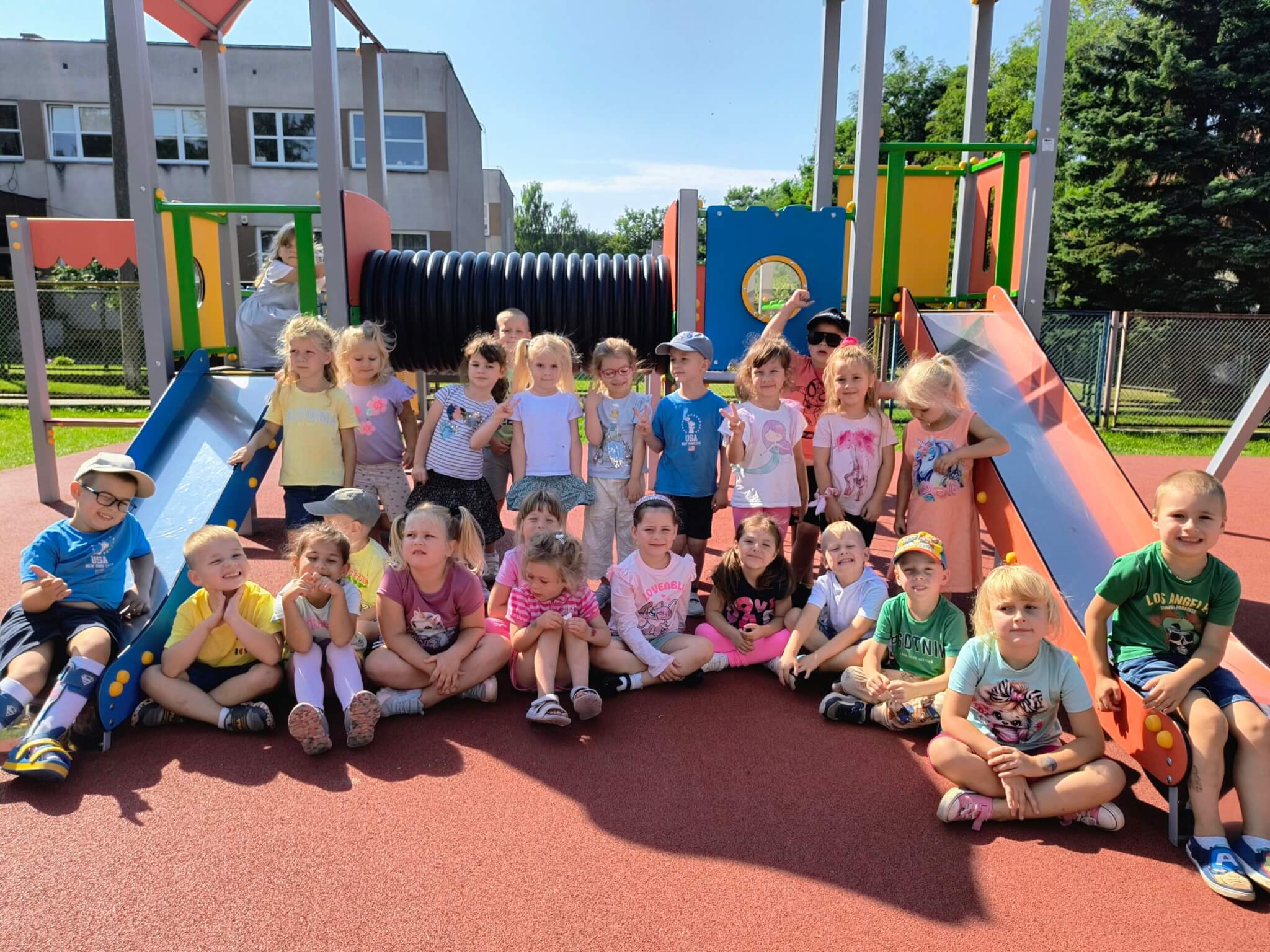 Słonecznie i ciepło rozpoczął się nasz pobyt w grupie V. Wrześniowa pogoda zachęcała nas do zabaw na dworze i korzystania w pełni z nowego placu zabaw.
