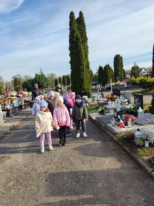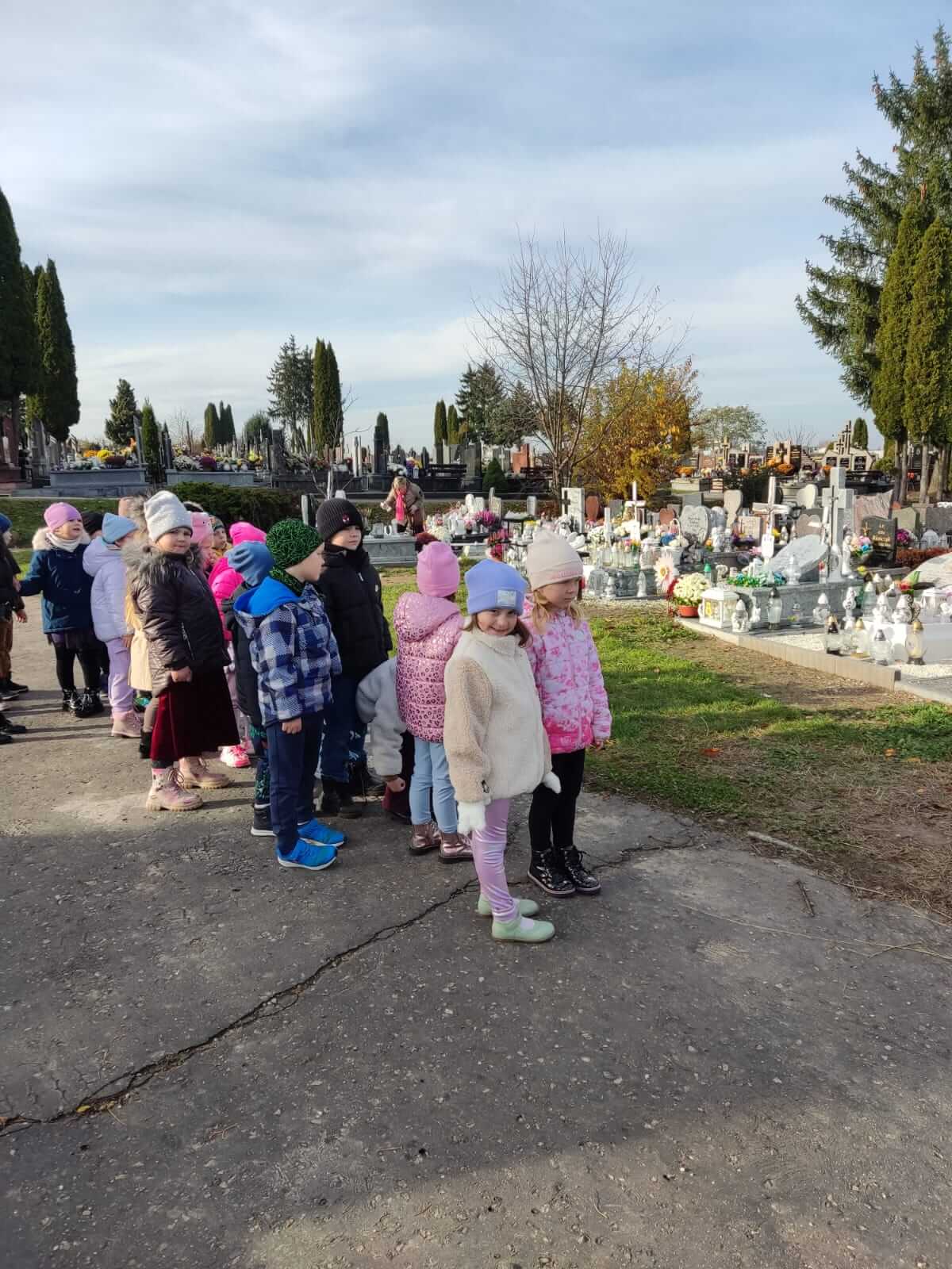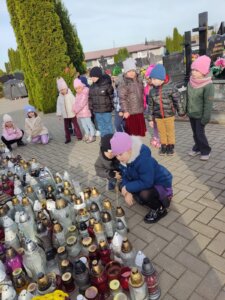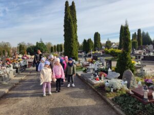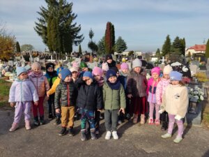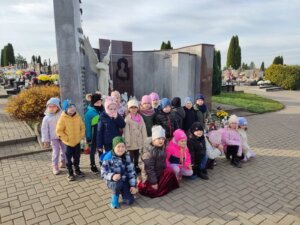 Miesiąc listopad jest szczególnym miesiącem, w którym czcimy pamięć zmarłych. W związku z tym odwiedziliśmy pobliski cmentarz. Byliśmy na grobie dzieci utraconych i zapaliliśmy znicz oraz na grobach małych dzieci. Odwiedziliśmy także grób naszego kolego Bartka, który uczęszczał do naszego przedszkola. Wspominamy także naszych bliskich zmarłych.