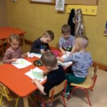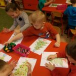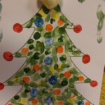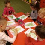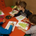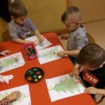 Podczas zajęć dzieci kolorowały i ozdabiały farbą plakatową sylwetę choinki.