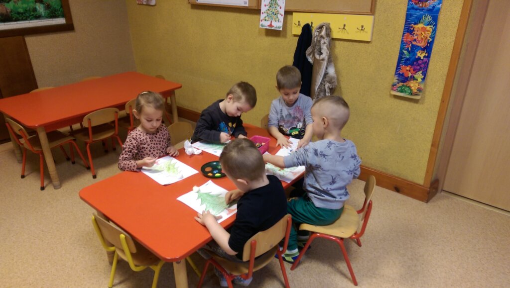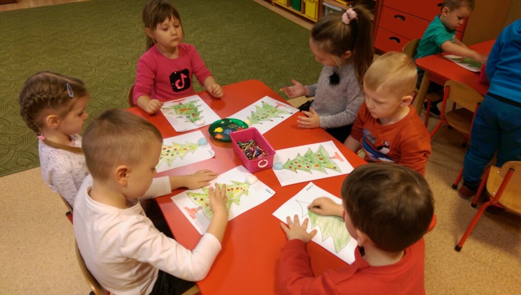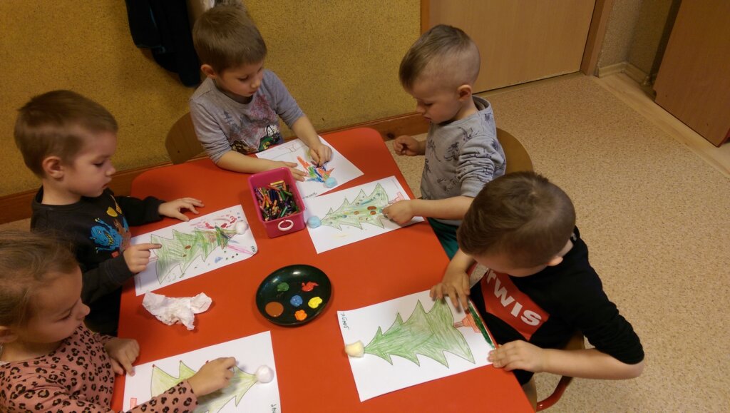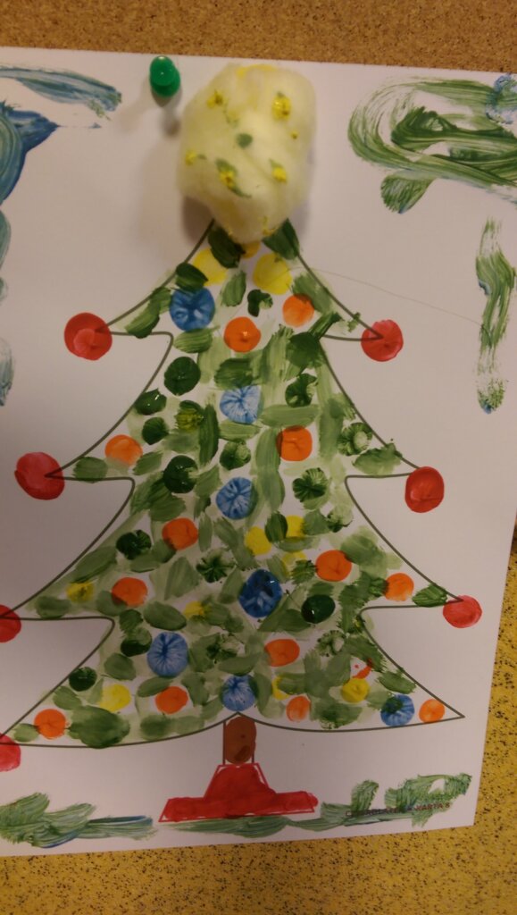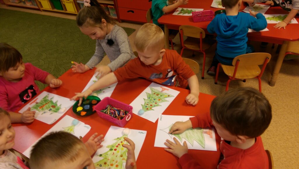Podczas zajęć dzieci kolorowały i ozdabiały farbą plakatową sylwetę choinki.